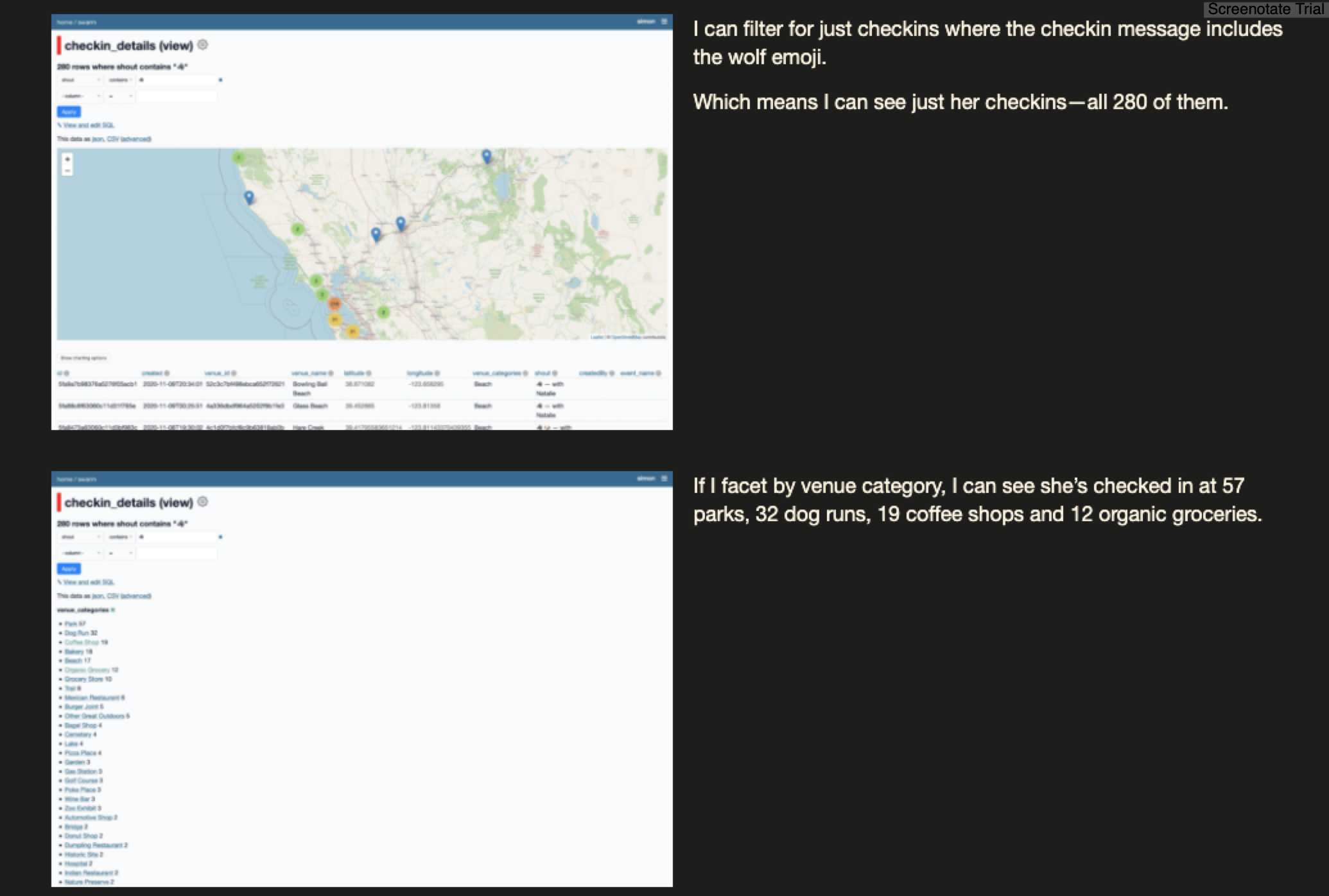generates map of all places his dog has been to using wolf emoji in swarm check-in message and then ingesting all swarm data