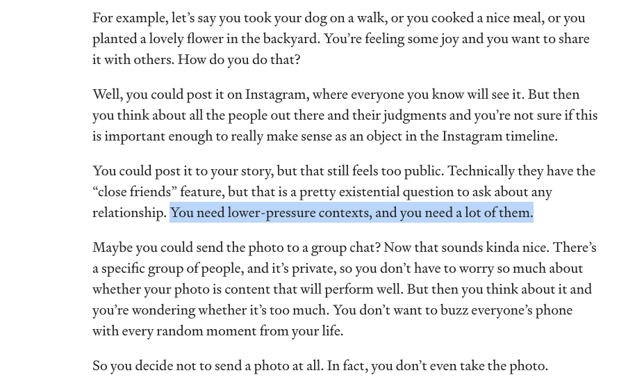 My general theory of social apps is that they compete on the basis of their network structures, rather than their content formats. The network structure—who sees what—is usually the main driver of value. Plus, it’s easy to copy a format (e.g. Stories), but a network structure is much more defensible.