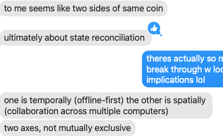 Effectively, they are two sides of the same coin. Offline is dividing the state temporally while real-time is dividing the state spatially. Effectively, CRDTs and decentralized software are about state reconcilation