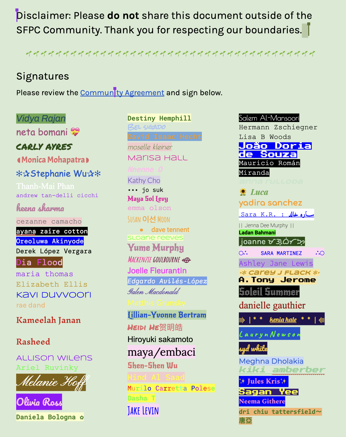 the signatures on the community agreement is amazing, great ex of taking agency in a space