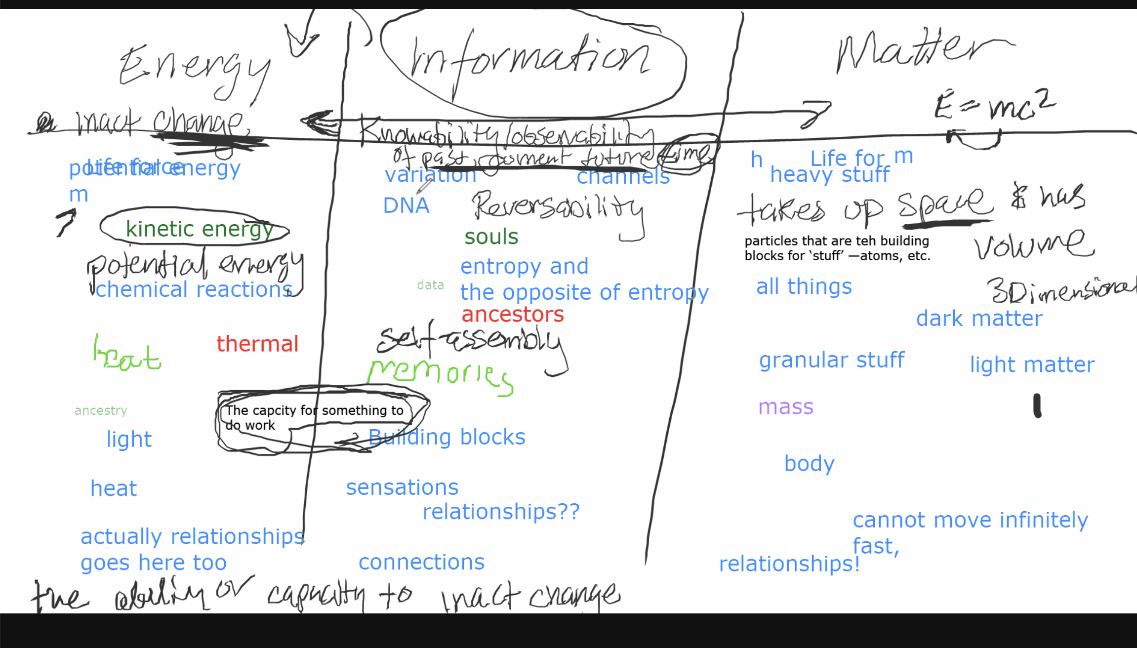 - information: knowability/observability of the past, current, or future states over time, matter is defined as stuff that takes up space and has volume, anything that’s three-dimensional