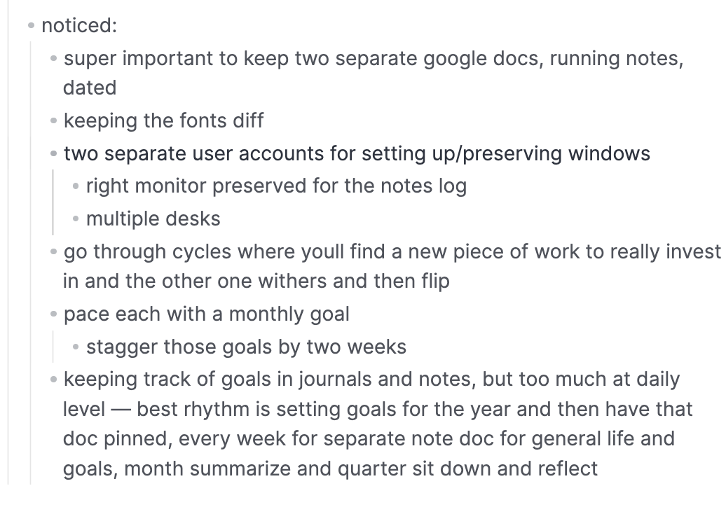 - diff personas / names / colors for yourself to delineate diff modes of writing or talking or what you’re thinking about (this maps effectively to “tags” in traditional note editors too)