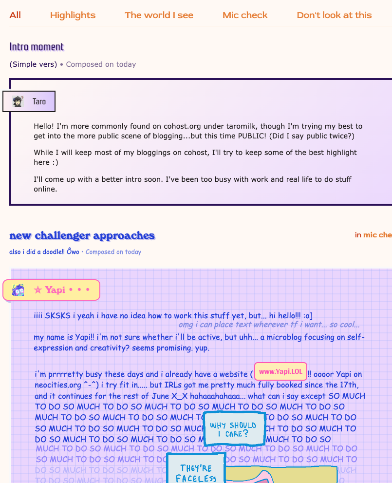 a microblogging site that allows everyone to customize their own style of posts so that a homepage is composed of updates in the flavor of personal site pages collated together