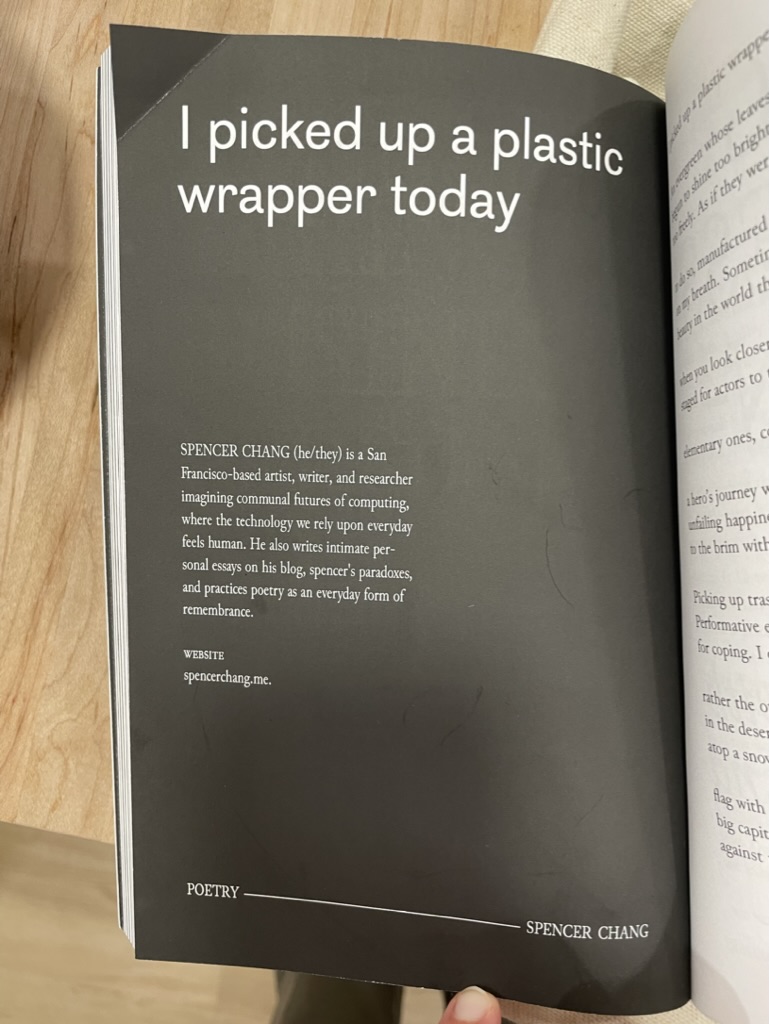 html garden is showing at the DeYoung as part of the DeYoung Open. My poem I picked up a plastic wrapper today is published in Kernel Mag 3 (and I got to give my first-ever live poetry reading for it!). I have another argumentative piece coming out in a publication shortly. And I’ve started working with Raymond on an app for collections, a central piece of my research that I’ve circled around for the past 8 months. We’re going to be exploring how we can create a fast local-first mobile client for gathering and curating collections and sharing that activity with people you care about. We’re planning for the client to be open-source and to plug into new open protocols for structured data. In practice, this means that you can have a single place that collates the data you care about across all your platforms, where the underlying data backing is owned by you. If you already have places that you love for doing this kind of activity (e.g. Are.na), then you can just use this as a configurable client for them. I’m really excited about this work because so many of my explorations around creating more human-first experiences of computing revolve around having this intimate everyday data easily available, whether windows into daily lives, or revisiting the things you care about, or sharing the moments in which you love living. If this is something that sounds interesting to you and you’d like to try it out, reply to this email or pass along a message to me!