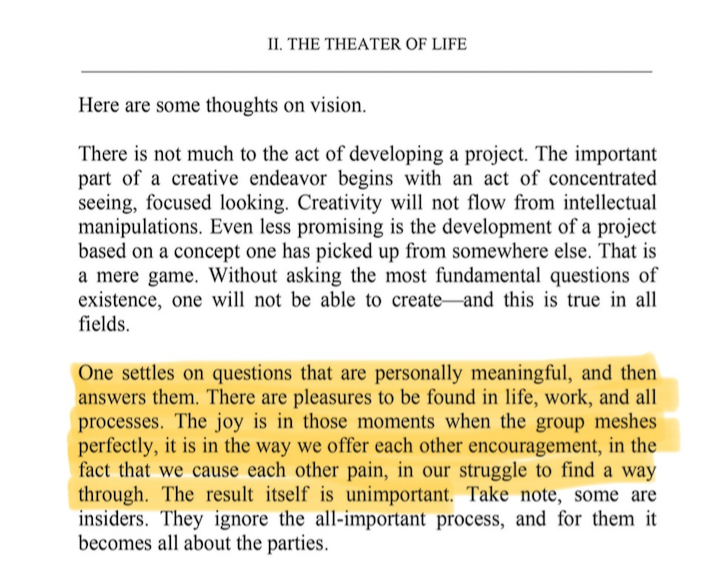 But maybe I should be feeling this way. It’s natural that I feel antsy when I’m trying to focus on so many things. Maybe this is part of the work that I so wish to avoid, part of “our struggle to find a way through” as Yohji Yamamoto recounts. Maybe a month of flailing to reorient my focus is a given. There are no free lunches, and so too does being independent (and working on whatever I want) come with the territory of enduring existential dilemmas and wavering motivations to see my questions through. This is not an easy lifestyle, nor is it something that can be forced all the time. Every day I feel like I’m answering my life’s questions. I should feel exhausted, even if all I do in a day is think about that question, even if these questions feel like my life’s calling. Really, all that matters, is that given the choice, I’d still choose it again, despite the history and the circumstances and the obstacles, again, despite all the pain and rejection and loneliness that it brings, again, because I remember the moments when it feels like I’m doing the most important thing I could be doing and “when the group meshes perfectly.” And so after my walk around the neighborhood, I sit back down, and I return to the struggle.