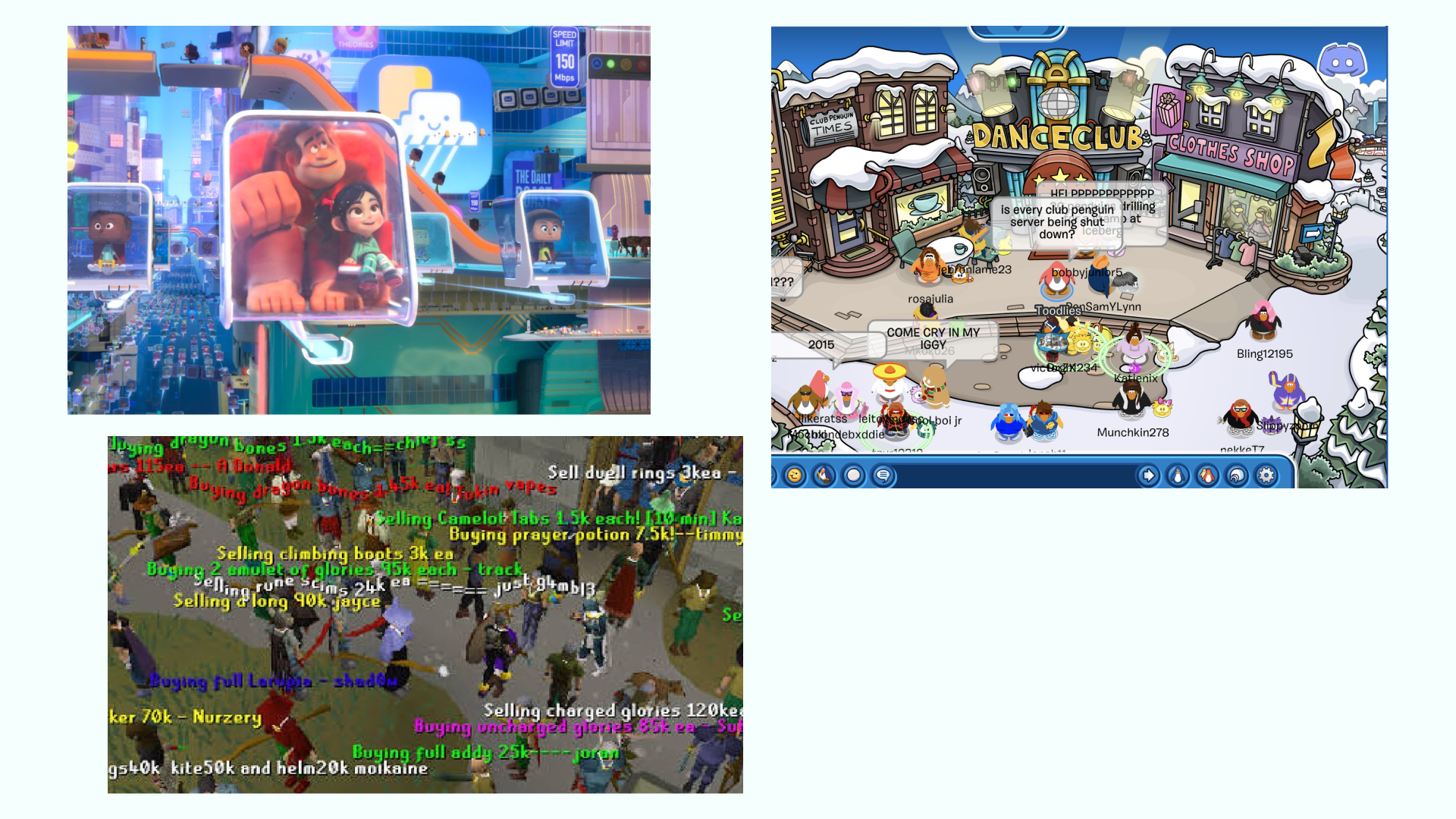 from top left, bottom left, right: 1) Ralph Breaks the Internet (source Vox) 2) Runescape marketplace text art advertising source 3) Club Penguin’s Dance Club (source The Verge)