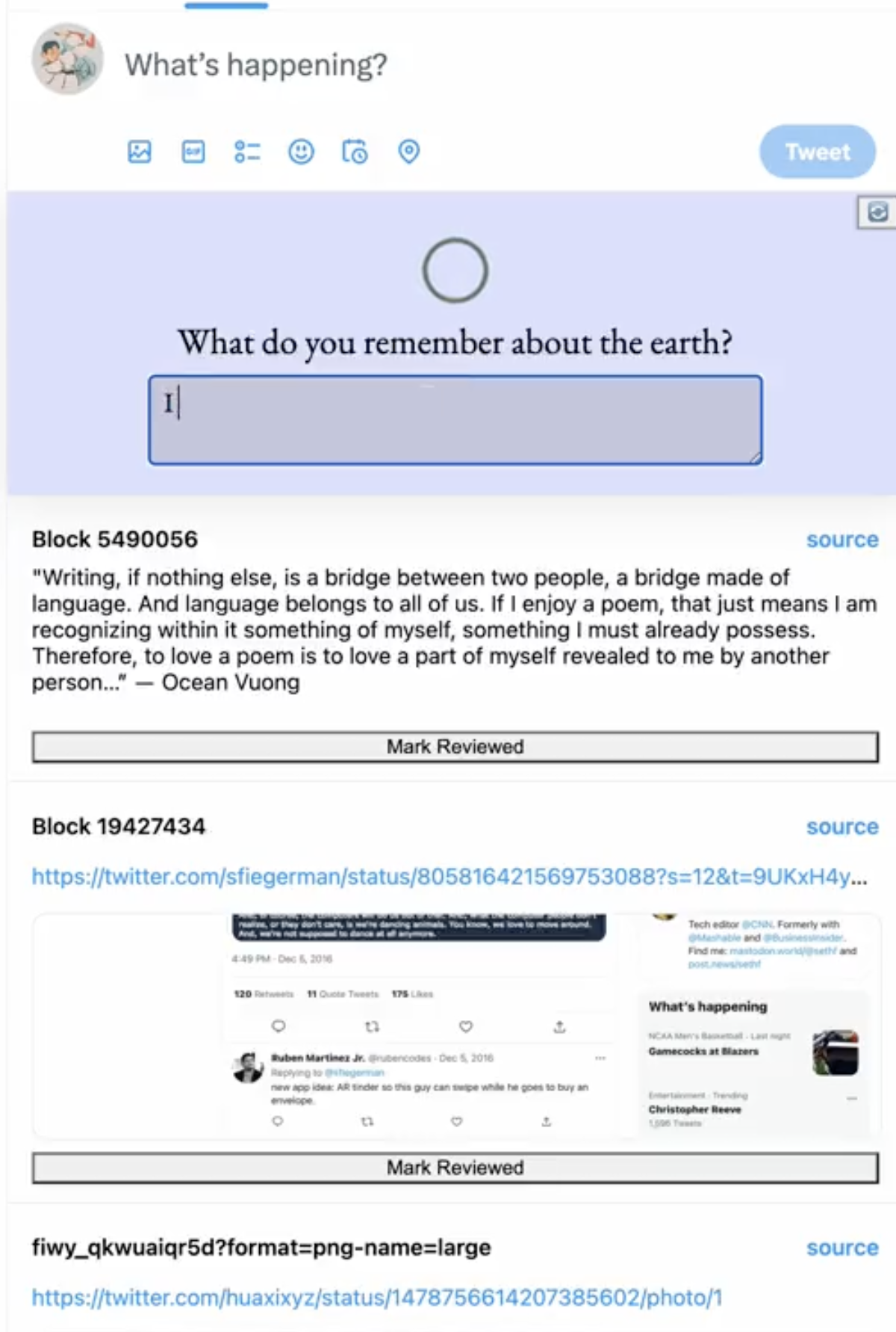 It’s on the backburner right now because I found that the current form is lacking something that makes it feel really good to use. I find that I get used to it and start scrolling immediately past it… Maybe it was because I was being exposed to too much old stuff because my bank of things to remember wasn’t that big? I also find that there was an inherent tension with the attention required of the things that I want to remember (usually dense and attention-intensive) and the kind of attention I wanted to spend when I was going to social media sites. This might work better if I focused on only image-focused / audio-focused media or pulled from a much larger repository of data (including things from friends that I might care about, maybe are.na channels that have a bunch of content that I don’t want to consume immediately?)