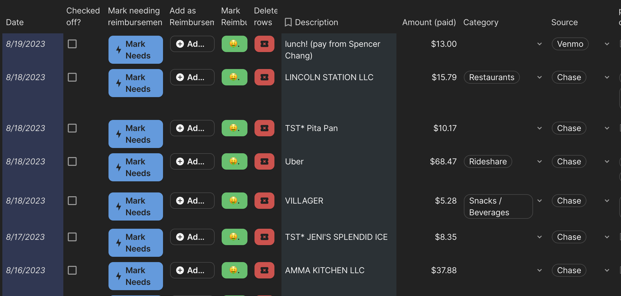 A lot of people have asked me if they can use this tool. The problem is that it uses so many custom-built quirky systems that I now have a trained mental muscle for operating which would be very confusing under traditional interface standards. For example, for some reason I decided that positive numbers would be expenses and negative numbers would be income early on. I also delete credit card payment charges (and the respective bank transfer transaction) because they don’t provide any new or extra information. And because I also include Venmo as an import source, I delete any transactions titled “Venmo” from my bank because they would double count the transaction when it pulls directly from account to pay. There’s all these weird practices I do that are now normalized because I don’t need to fix these things in order for it to work for me.