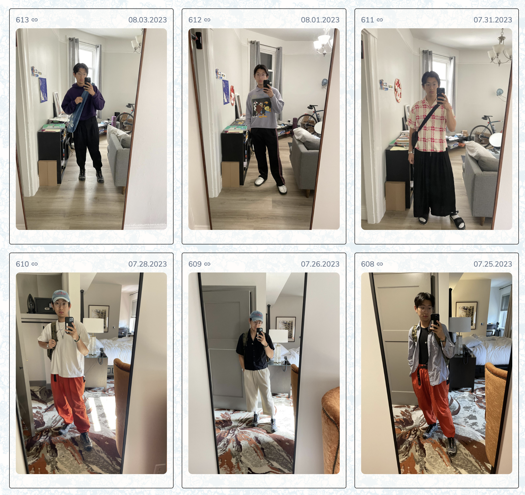 This project was an experiment in personal data archival for a practice I started of taking a picture of my outfit every day. I initially started doing this in a Twitter thread, but I didn’t like how that spammed my existing timeline. Ultimately, I wanted a place I could store the data that could easily extend into new interfaces for showing the data and a mostly automated method that built off of my existing practice (of uploading it to an iCloud album). So I embarked on a quest to make my own data archival repository (named reservoir). This relies on a script that I run on my computer to extract photos (and corresponding metadata) from my “fits 🧢” album, uploads the photos to an S3 bucket, dumps the metadata into a fits.json file hosted on my website, and I render all the fits at https://www.spencerchang.me/fits. In the end, I effectively have my own data pipeline and warehouse just for my fits! Ideally, I wouldn’t even have to run the script, but unfortunately programmatic access to Apple Photos is terrible.