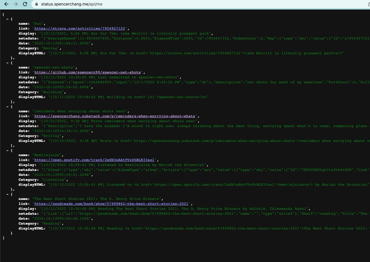 I’m reflecting that a bunch of these tiny apps were made in order to enable some “live” widget on my website. My status API is an API that returns some of my latest activities, captured from different data sources. This ends up powering the marquee on my personal website, showing my latest activity.