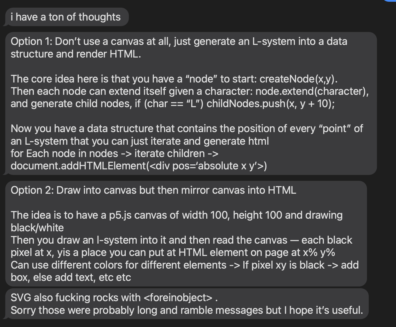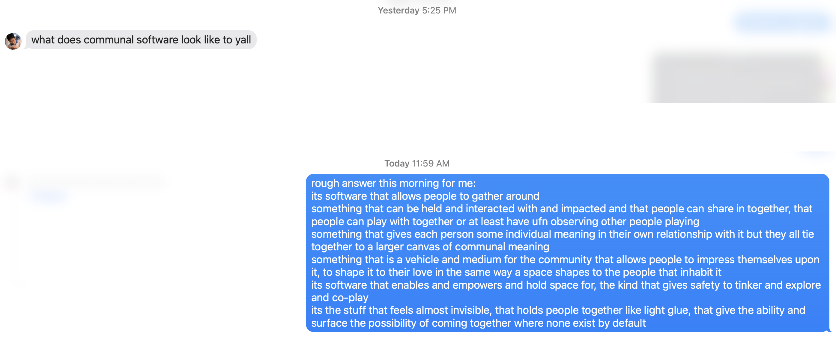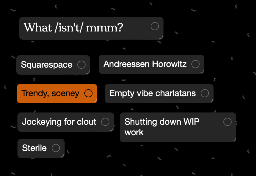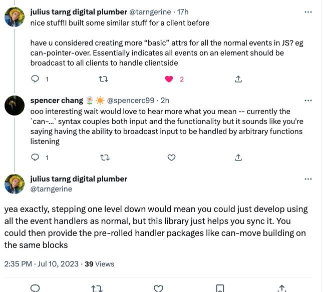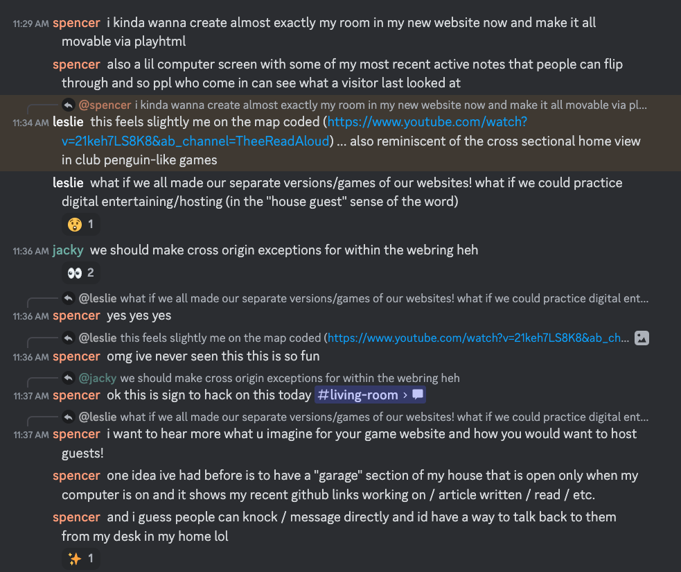 Soooo what do i do with my life. I just listened to a metamuse podcast with steve ruiz of tldraw and one key thing that stood out to me with how he ended up betting on tldraw is that it was a commodity-like system that still lacked a great status quo. Like with text editors before, there was no standard drawing component for people to use in software. Steve aimed to become the status quo with an easy extension system for people to make their own objects on the canvas. This doesn’t really ring true for the things I’m working on… playhtml is completely dependent upon partykit and cannot survive on its own. gather is not really a component for people to plug into an existing system, it is an incredibly personal and people-first tool. I guess all my things are very personal and people-first. It shouldn’t be a surprise because the thing that really draws me to any project is the possibility for creating systems of solidarity.
