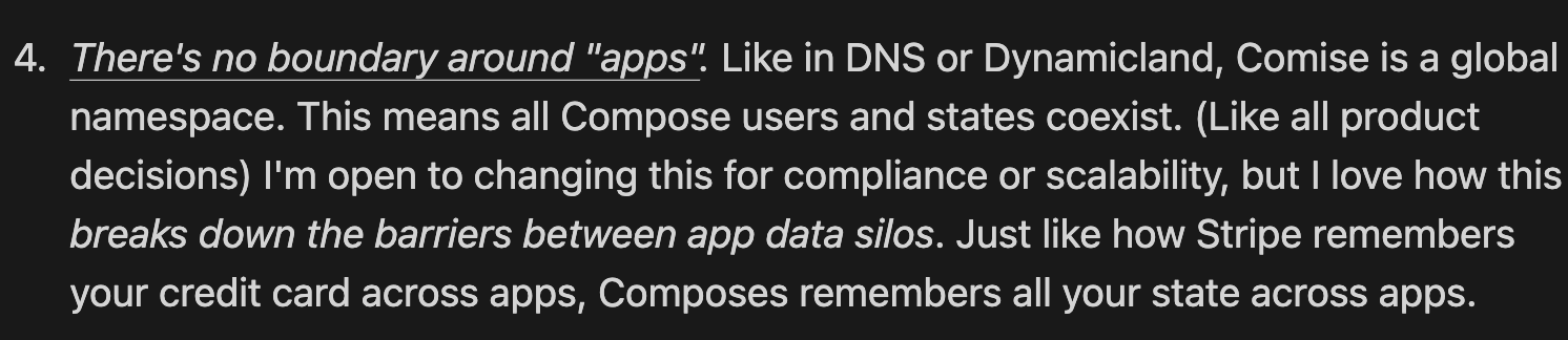 - the big simplifying mechanism is if you are able to bring your own data storage or persistence method (like with Shortcuts and using iCloud or Dropbox or even Notes as your persistence method, this is obviously not great for structured data though, but you could imagine doing it with something like JSON or csv or sqlite even..)