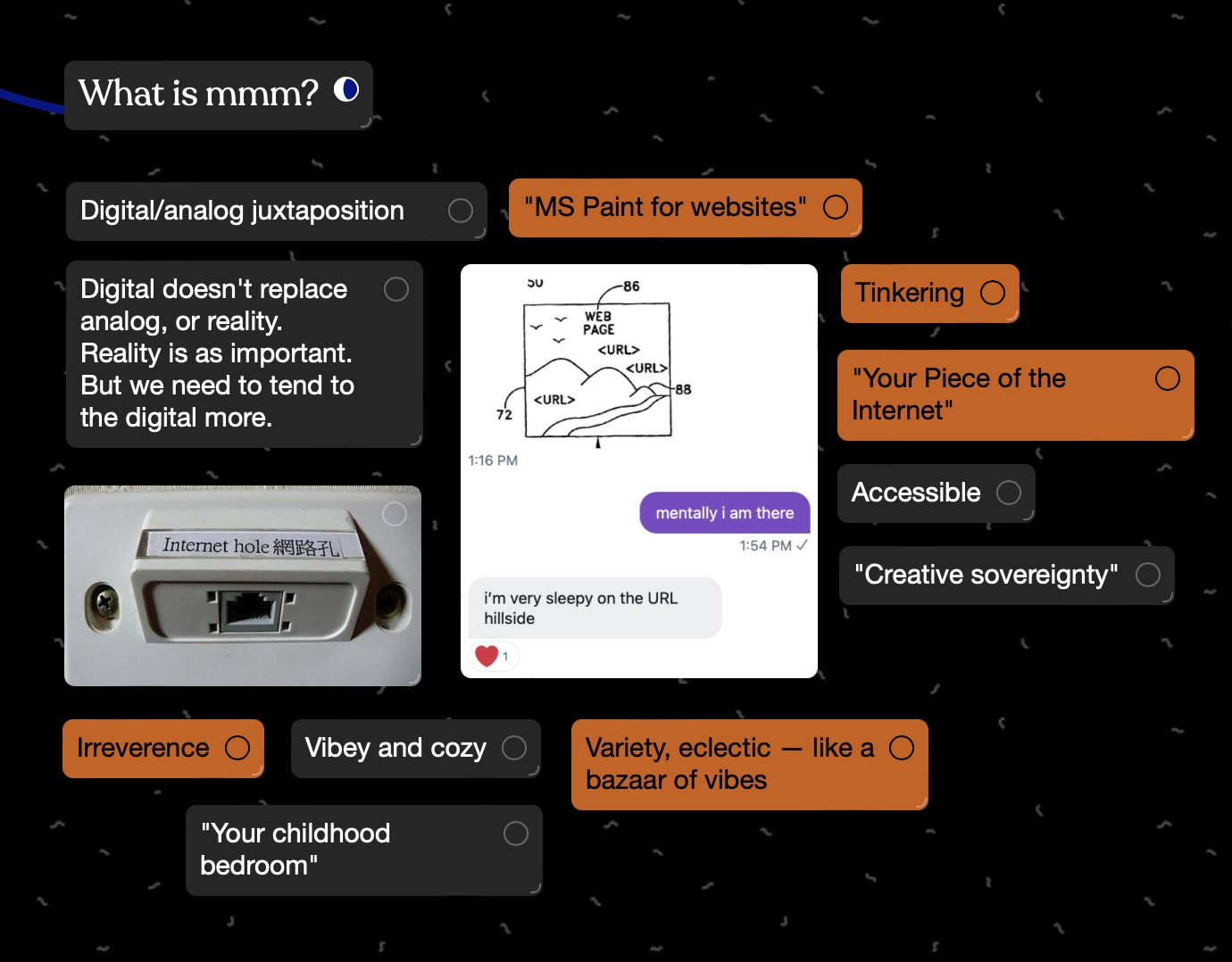 - i started writing notes on a new internet recording what people from various corners of the frontier of “reinventing the internet” are saying and proposing Along with the increased mainstream coverage about the poetic web, html energy, and cozy web practices, it really seems like this year will be the start of an accelerated normalization of the desire for a better internet. Bluesky has a ton of hype accordingly and decentralized web movements are becoming at least semi-legible to normal people. (In some ways, the acquisition of Twitter might be compared to the election of Trump in having an overall positive effect on the ecosystem by providing a traumatic “wake” for common people).
