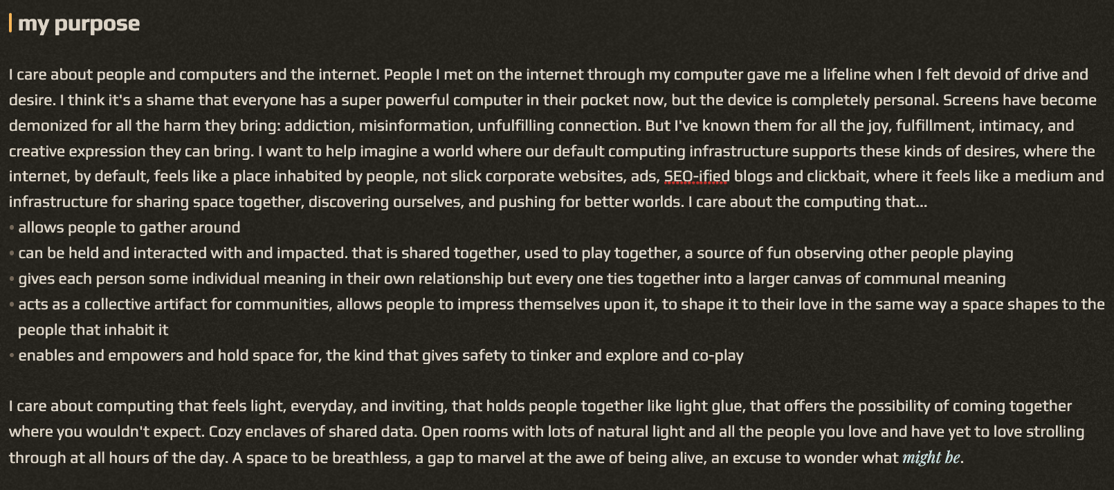 - obscure references and personal dedications and handmade collages of phone pictures rather than seo-optimized content and GPT-generated images