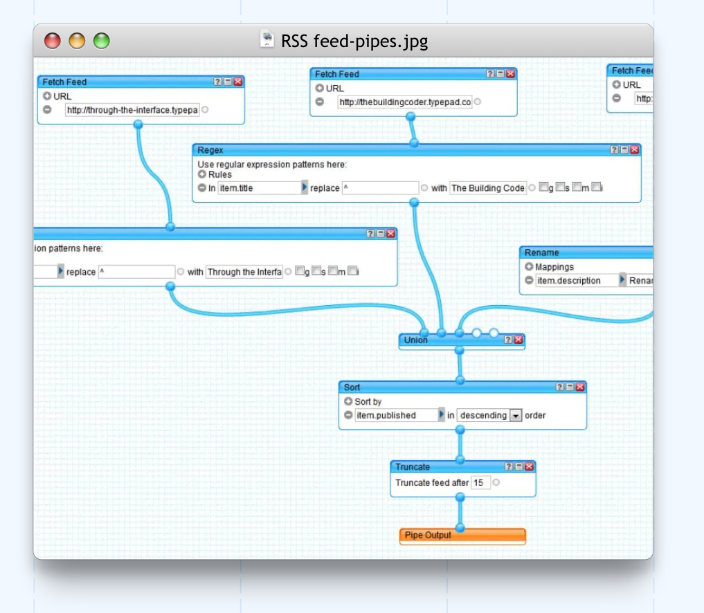 Pipes output could be embedded into a page or formatted as HTML, JSON, KML, RSS, or XML. There was even a way for a non-Yahoo website to include JavaScript that queried a Pipe workflow and received the results back without any front-end browser or back-end server involvement. Pipes, in effect, could power other sites.