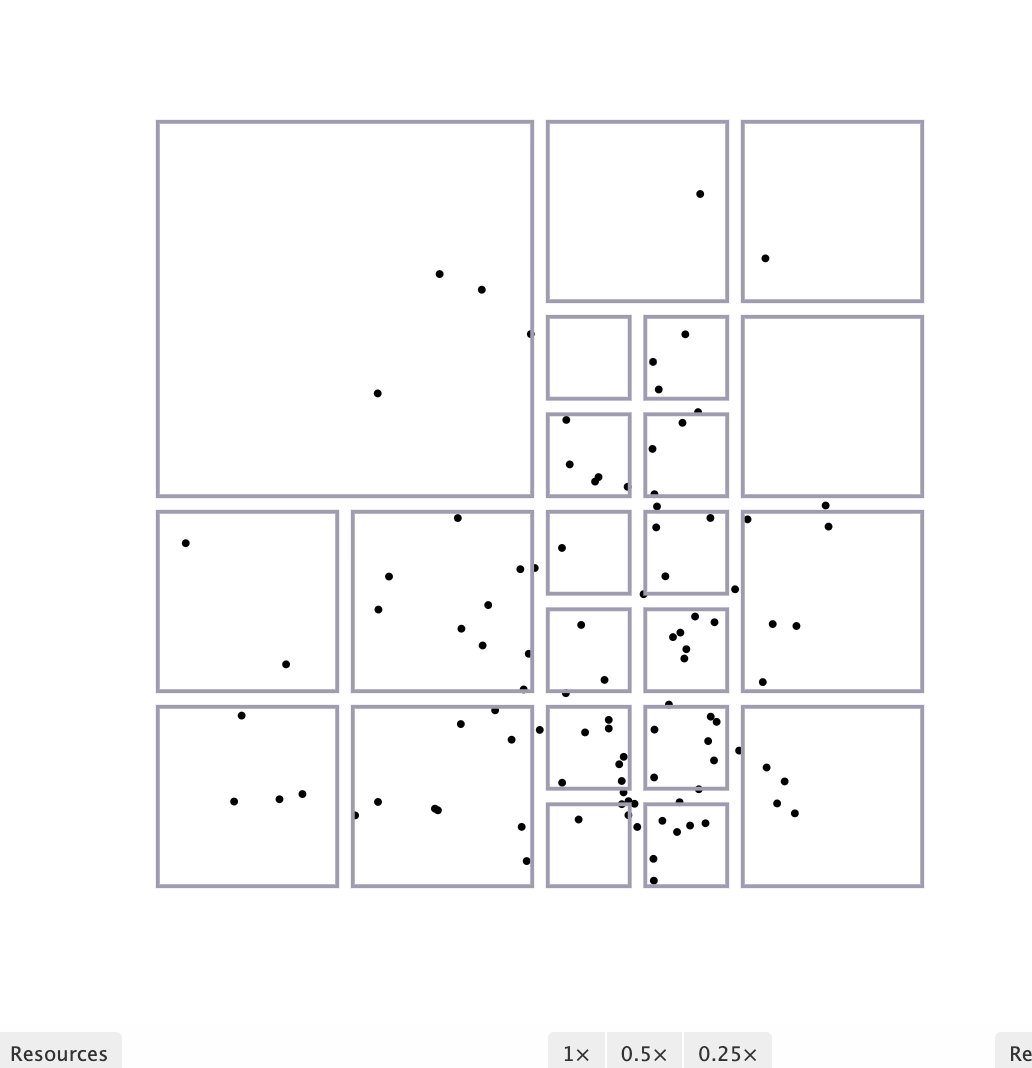 { x, y }points to a 2D space. In this example, the point’s positions are random but biased towards a focal point. - Subdivide the space into quadrants based on the density/position of the points