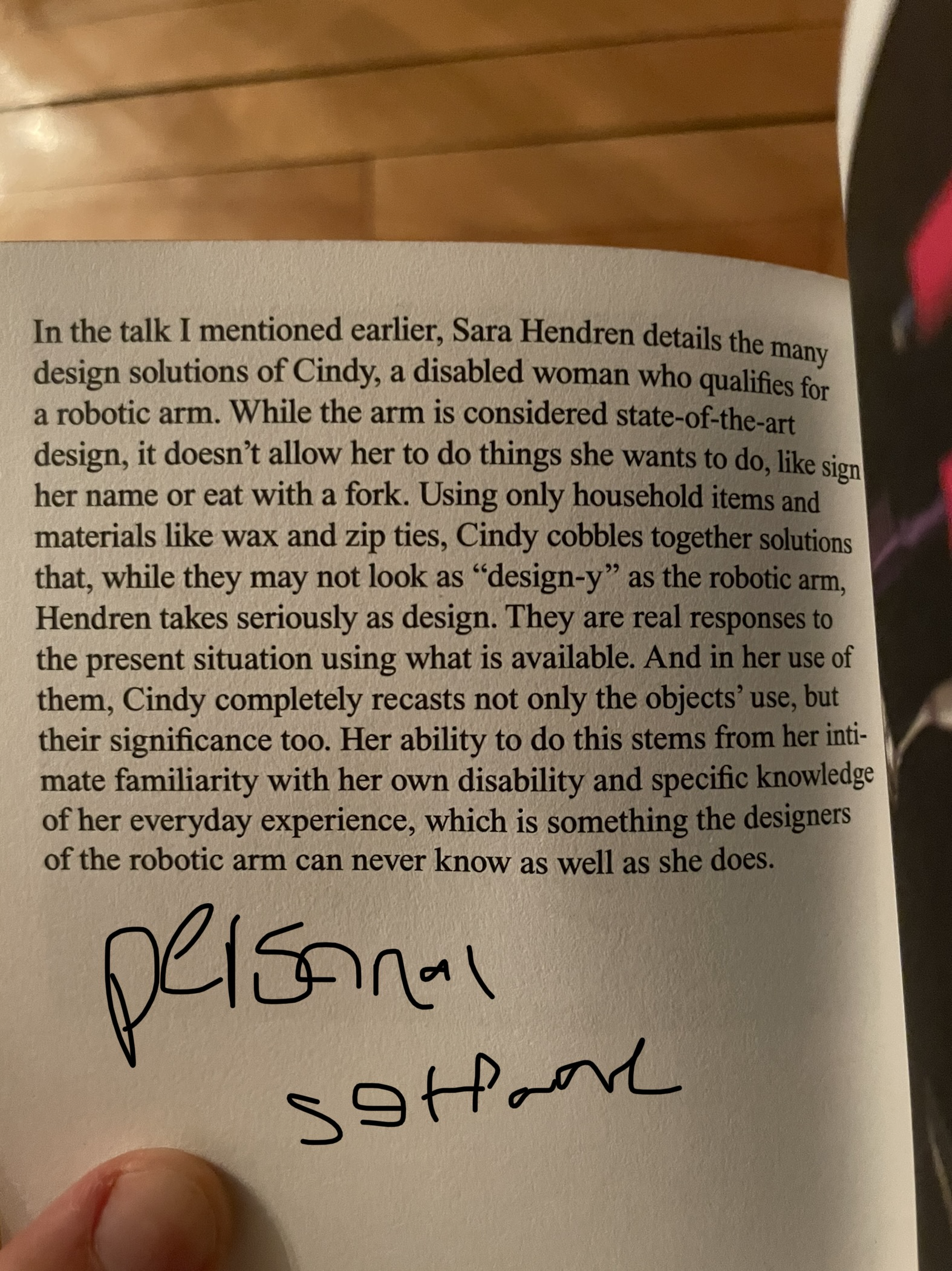 disabled woman who got a fancy expensive robot arm but then created a bunch of home devices for herself because it wouldn’t let her do the basic things she wanted. Fantastic example of Situated Software