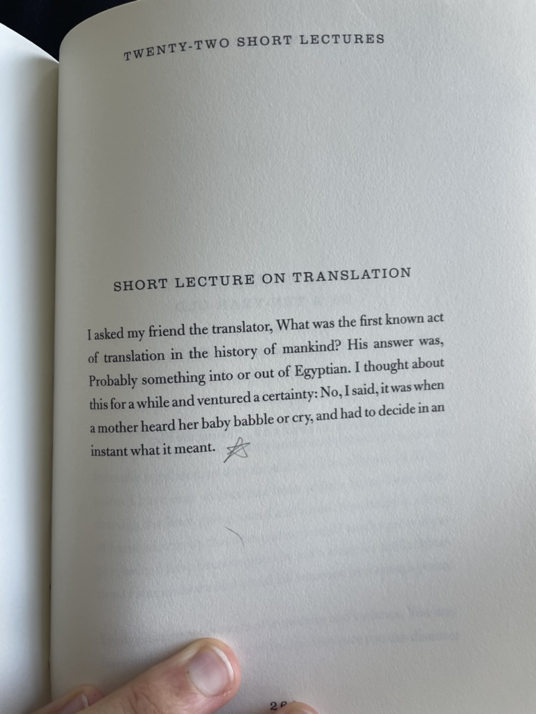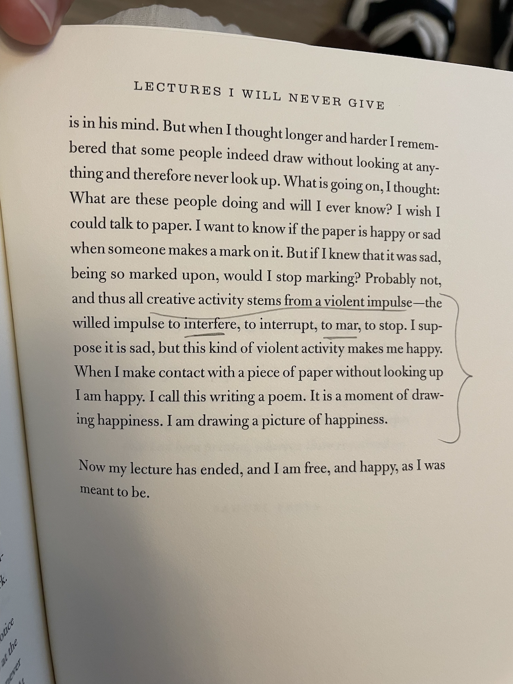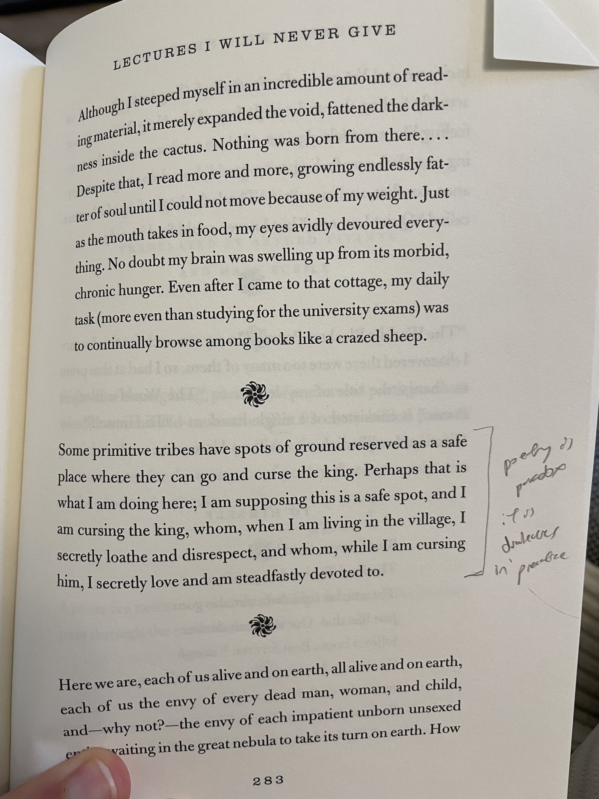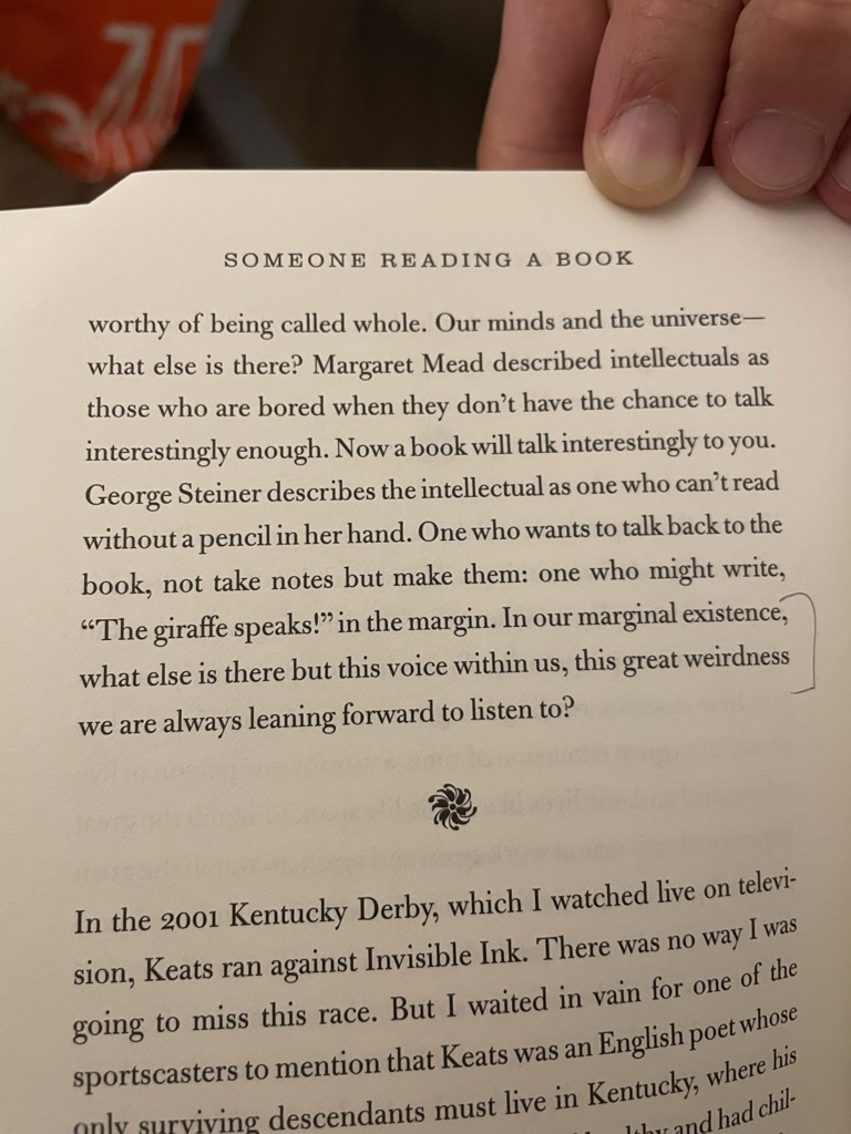 George Steiner describes the intellectual as one who can’t read without a pencil in her hand. One who wants to talk back to the book, not take notes but make them: one who might write, “The giraffe speaks!” in the margin. In our marginal existence, what else is there but this voice within us, this great weirdness we are always leaning forward to listen to?