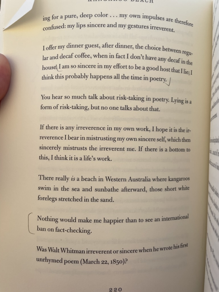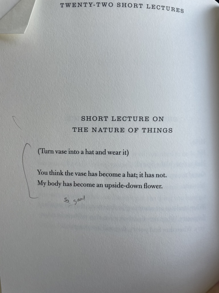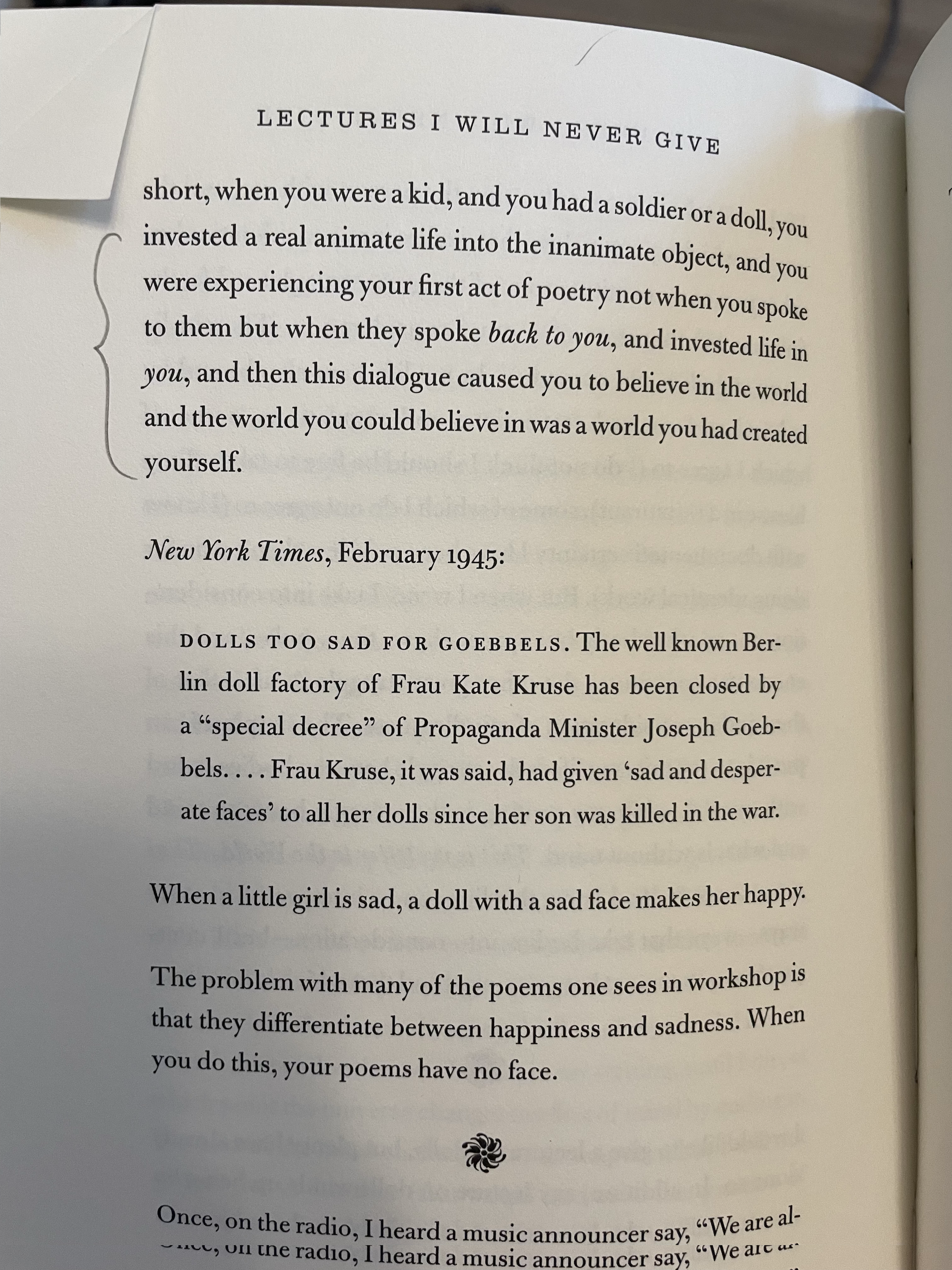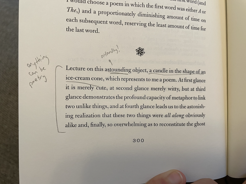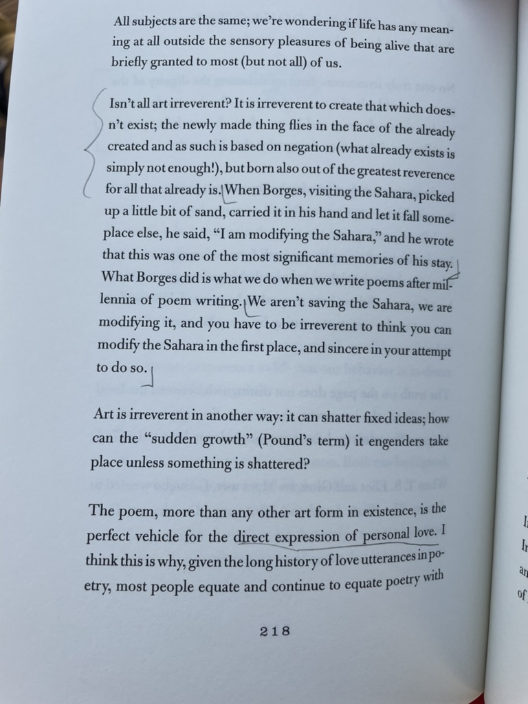 George Steiner describes the intellectual as one who can’t read without a pencil in her hand. One who wants to talk back to the book, not take notes but make them: one who might write, “The giraffe speaks!” in the margin. In our marginal existence, what else is there but this voice within us, this great weirdness we are always leaning forward to listen to?