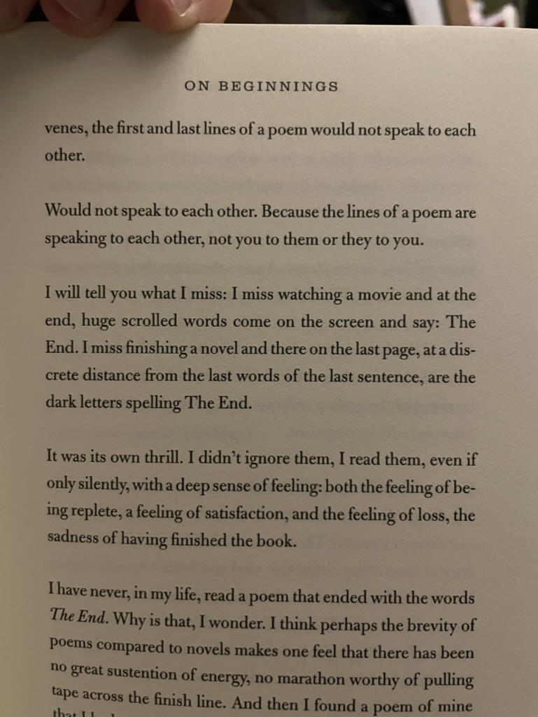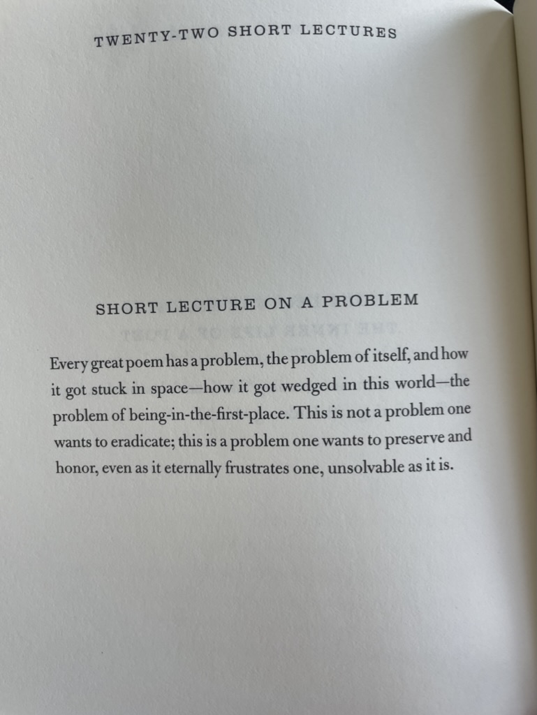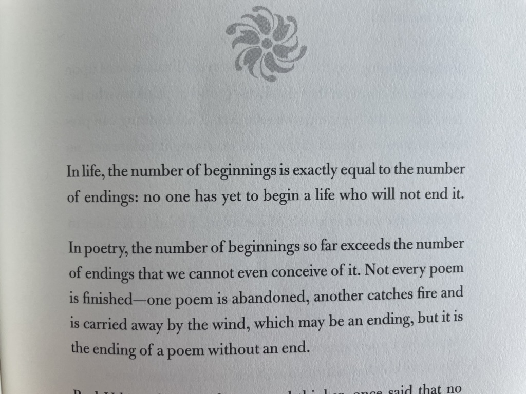 You might say a poem is a semicolon, a living semicolon, what connects the first line to the last, the act of keeping together that whose nature is to fly apart. Between the first and last lines there exists—poem—and if it were not for the poem that intervenes, the first and last lines of a poem would not speak to each other.