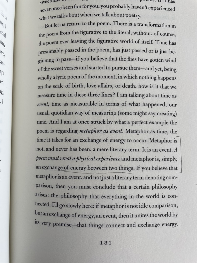 Metaphor is not, and never has been, a mere literary term. It is an event. A poem must rival a physical experience and metaphor is, simply, an exchange of energy between two things.