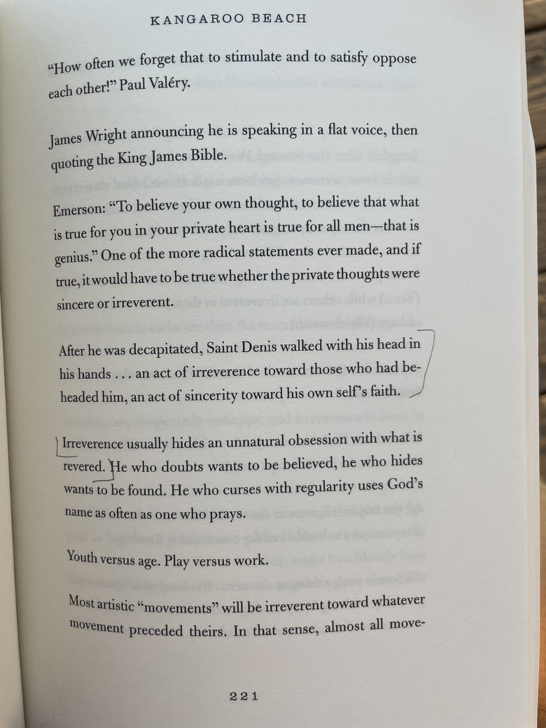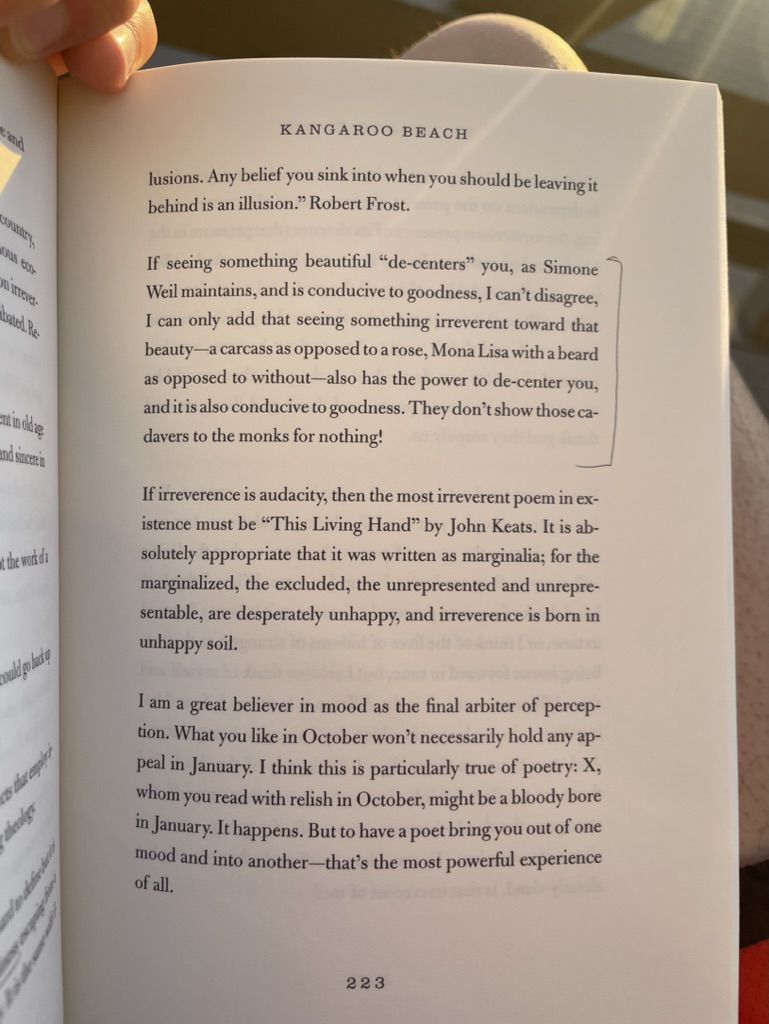 If seeing something beautiful “de-centers” you, as Simone Weil maintains, and is conducive to goodness, I can’t disagree, I can only add that seeing something irreverent toward that beauty—a carcass as opposed to a rose, Mona Lisa with a beard as opposed to without -also has the power to de-center you, and it is also conducive to goodness. They don’t show those cadavers to the monks for nothing!