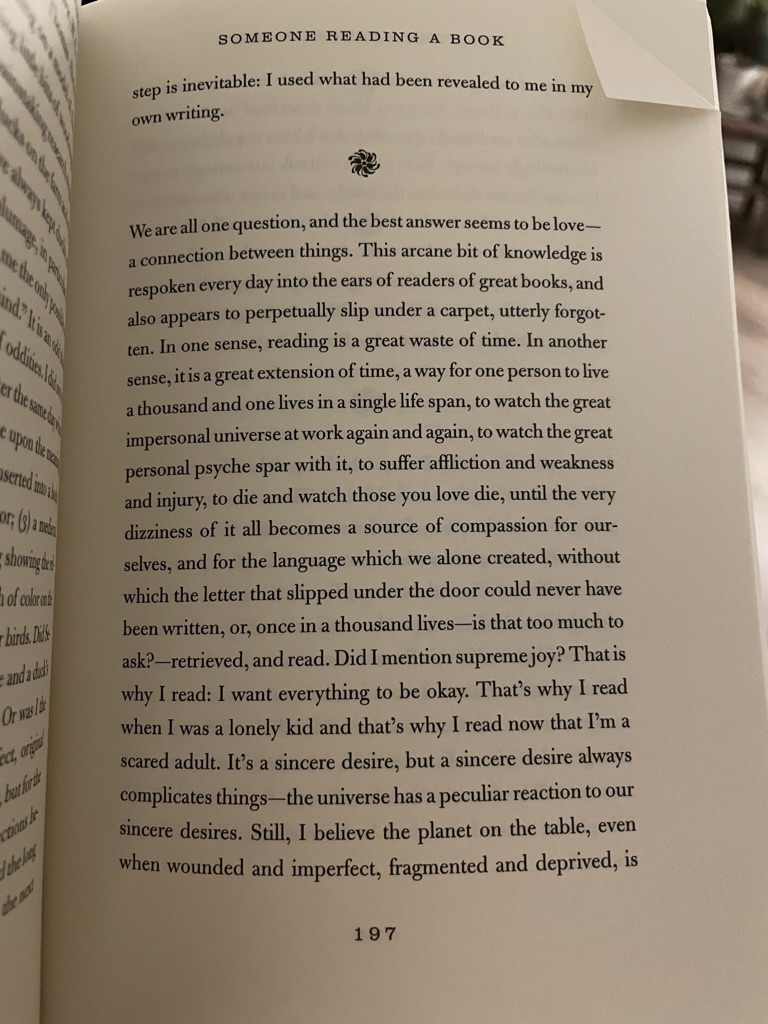 Did I mention supreme joy? That is why I read: I want everything to be okay. That’s why I read when I was a lonely kid and that’s why I read now that I’m a scared adult. It’s a sincere desire, but a sincere desire always complicates things—the universe has a peculiar reaction to our sincere desires.