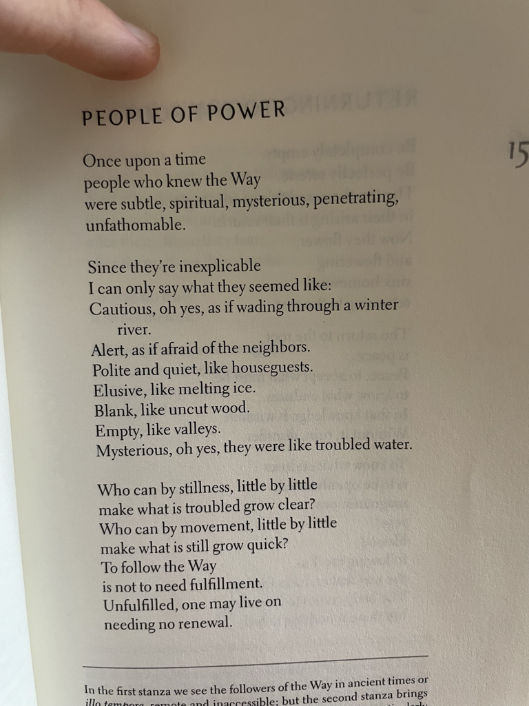 Main theme is around “not doing” as the way to actually get things done, the art of letting things happen the right way. It’s almost like a spiritual analog to the political ideology of anarchism. Le Guin says that anarchists can’t be pessimists, because they are relying on the goodness of people to act in the right way (or maybe the rationalism or incentives or whatever set of environment and circumstances that lead them to behave that way). There is a certain privilege in being able to think this way. Sometimes you can’t afford to do by not doing or wait for the right timing or preserve the uncut wood. Sometimes you have to bluster forward to forge the path and make the noise and demand change?