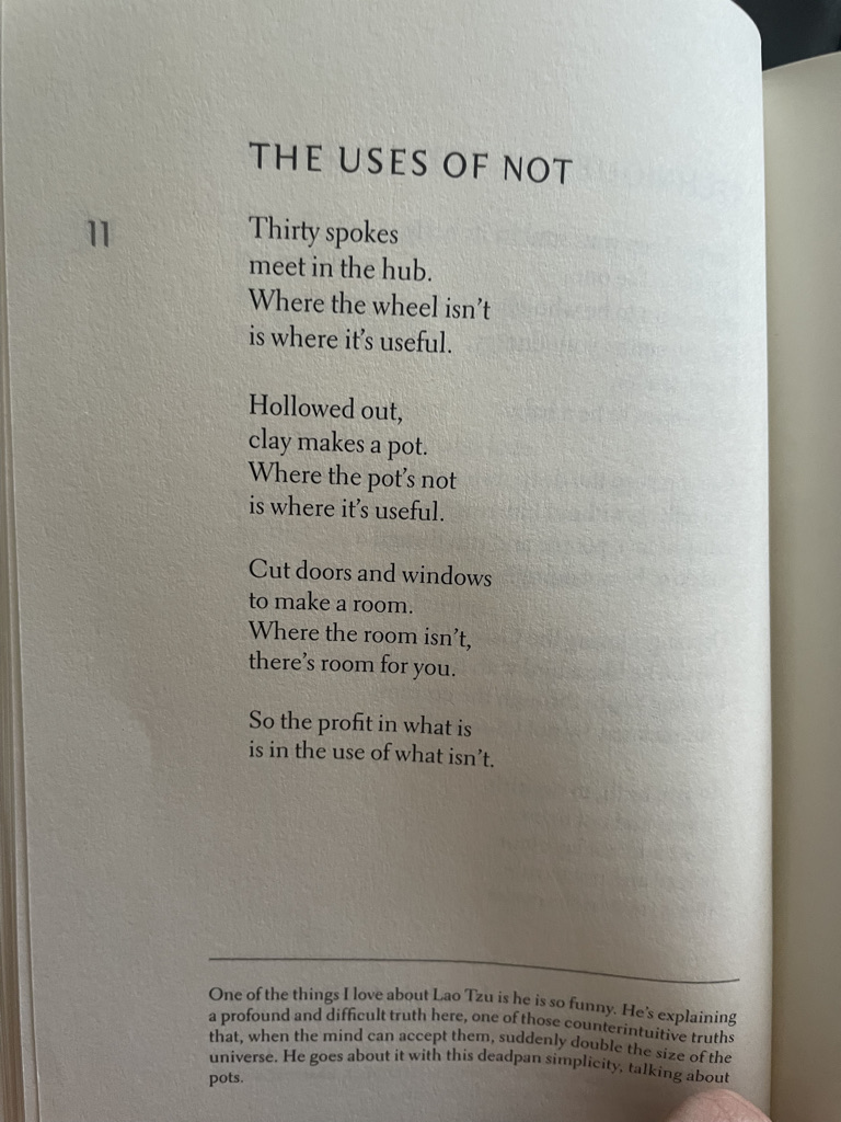 The not doing piece resonates with me in the observation that wise people do all easy things (the wise soul / by treating the easy as hard / doesn’t find anything hard) and how softness beats hardness. This makes me think about how everything everywhere all at once was filmed in such a small time by such a small crew under such a small budget. Greatness is forged in some set of scarce circumstances, not scarce to the point where you can’t do anything, but there’s some function in not being able to do whatever you want. Operating within reasonable constraints is useful. That’s why deadlines are so useful too.