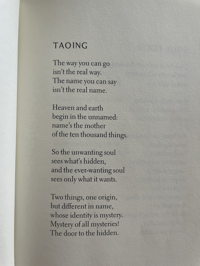 The Tao Te Ching is partly in prose, partly in verse; but as we define poetry now, not by rhyme and meter but as a patterned intensity of language, the whole thing is poetry. I wanted to catch that poetry, its terse, strange beauty. Most translations have caught meanings in their net, but prosily, letting the beauty slip through. And in poetry, beauty is no ornament; it is the meaning. It is the truth. We have that on good authority.#permanent#quote poetry is a patterned intensity of language