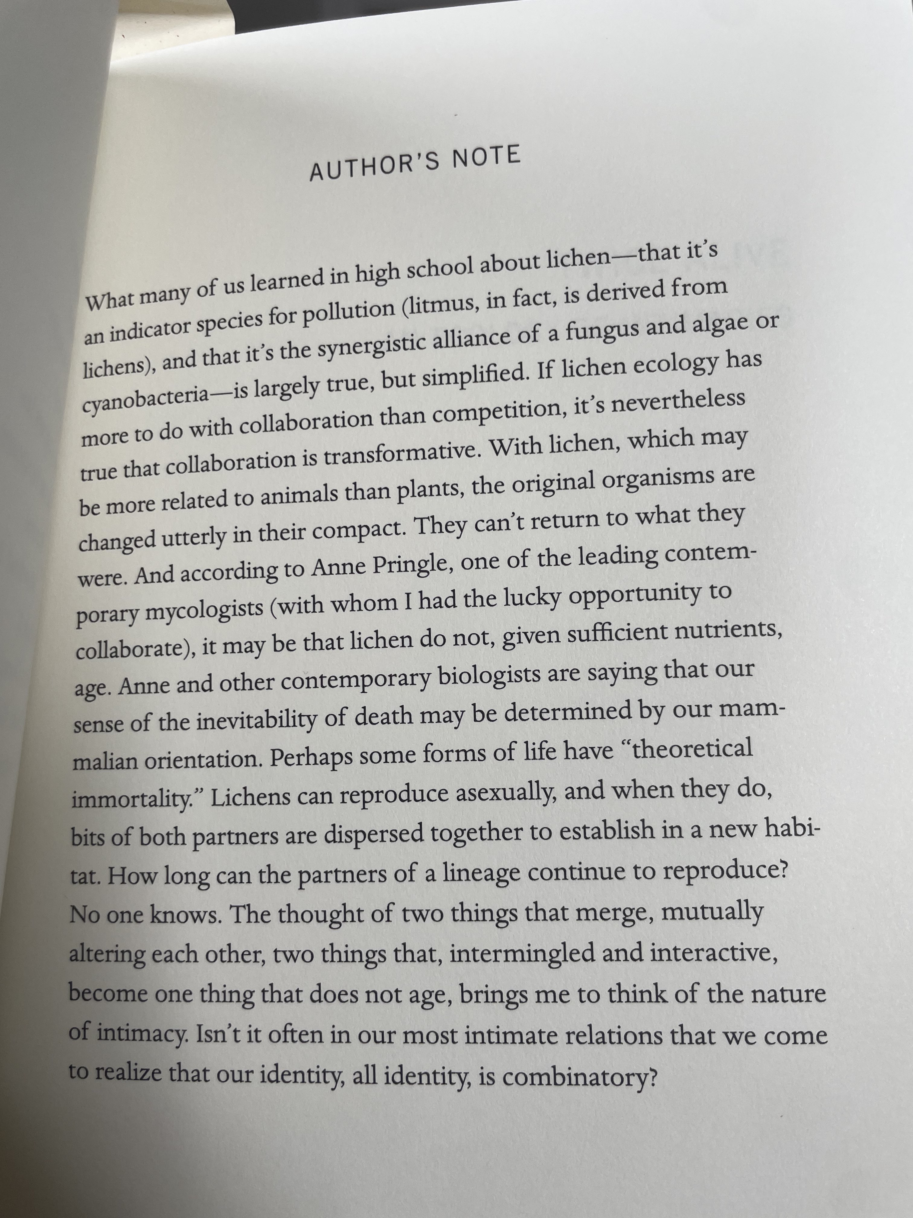 What many of us learned in high school about lichen-_ that it’s an indicator species for pollution (litmus, in fact, is derived from lichens), and that it’s the synergistic alliance of a fungus and algae or cyanobacteria- is largely true, but simplified. If lichen ecology has more to do with collaboration than competition, it's nevertheless true that collaboration is transformative. With lichen, which may be more related to animals than plants, the original organisms are changed utterly in their compact. They can’t return to what they were. And according to Anne Pringle, one of the leading contem- porary mycologists (with whom I had the lucky opportunity to collaborate), it may be that lichen do not, given sufficient nutrients, age. Anne and other contemporary biologists are saying that our sense of the inevitability of death may be determined by our mam- malian orientation. Perhaps some forms of life have "theoretical immortality." Lichens can reproduce asexually, and when they do, bits of both partners are dispersed together to establish in a new habi- tat. How long can the partners of a lineage continue to reproduce? No one knows. The thought of two things that merge, mutually altering each other, two things that, intermingled and interactive, become one thing that does not age, brings me to think of the nature of intimacy. Isn't it often in our most intimate relations that we come to realize that our identity, all identity, is combinatory?