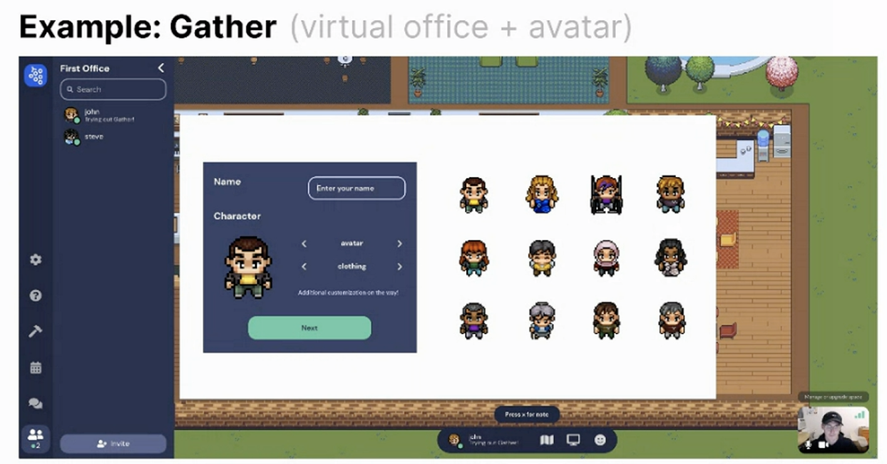 - imagine figma canvas with gather avatar. it’s weird. gather office with figma cursor also weird. doesn’t feel like im in the office, im in some god mode
