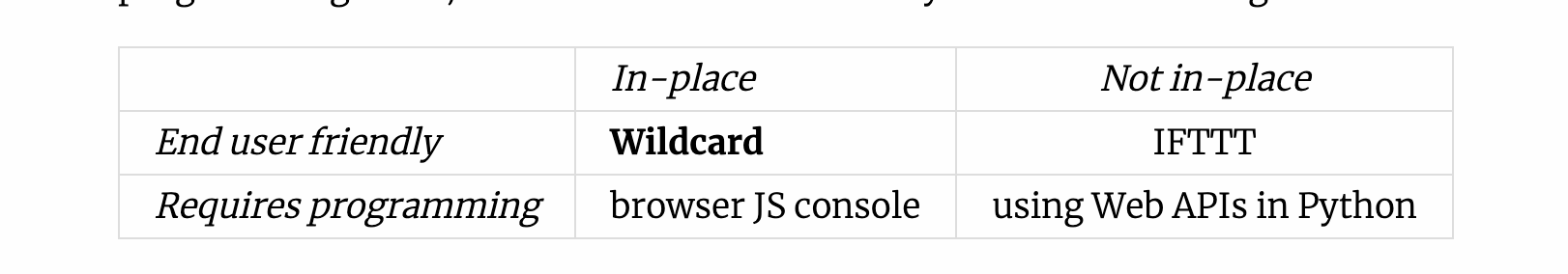 Wildcard provides an in-place toolchain because the spreadsheet can be instantly opened in the browser window while using any supported website. Once the user starts editing, Wildcard also provides live feedback, so that even if a user isn’t yet totally familiar with Wildcard, they can learn to use the system through experimentation.