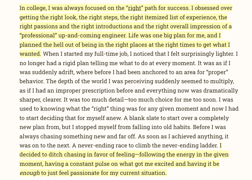 I have a little reminder that shows me my notes “on this day” a year ago, which includes my reflection on the mid-twenties on turning 24. My existentialism was out and dancing then. My reflection reads as a winding wish list or a prayer litany. I’m free now and I want to use that freedom for the things I love. It feels like something you’d write at the cusp of a change, a piece of “faking it” that you write to convince yourself that you’re different from who you are in the moment. As is my tendency, it ends on an optimistic note, but you can’t help but feel like there’s an undercurrent of yearning that is being covered up by hopeful placards.